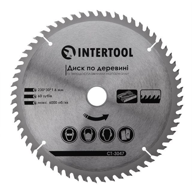 Диск пильный по дереву с твердосплавными напайками 230*30*1.6 мм, 60 зубьев INTERTOOL CT-3047