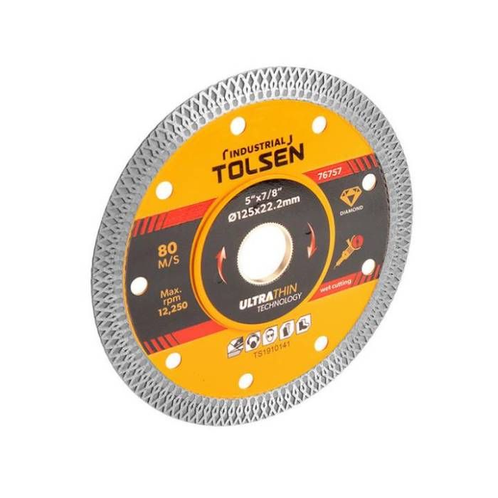 Диск алмазний ультратонкий Tolsen 125 х 22,2 мм Турбо 10 х 1,4 мм Профі призначений для точного різання твердих матеріалів, таких як бетон, камінь, кераміка та мармур. Завдяки ультратонкій конструкції з товщиною 1,4 мм, забезпечується чистий і швидкий різ без надмірного перегріву або сколів. Турбодизайн сегментів сприяє ефективному охолодженню диска та підвищенню його стійкості до зносу, що дозволяє використовувати його в інтенсивних роботах. Діаметр посадкового отвору 22,2 мм підходить для більшості кутових шліфувальних машин.