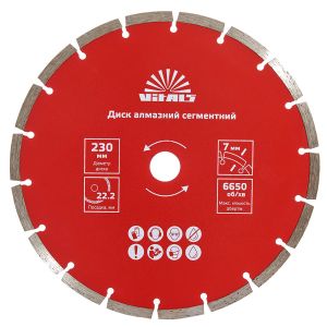 Диск алмазний сегментний Vitals230х22.2х7 мм призначений для ефективного різання бетону, тротуарної плитки, цегли, граніту, каменю та черепиці. Може використовуватися як для сухого, так і для мокрого різання.