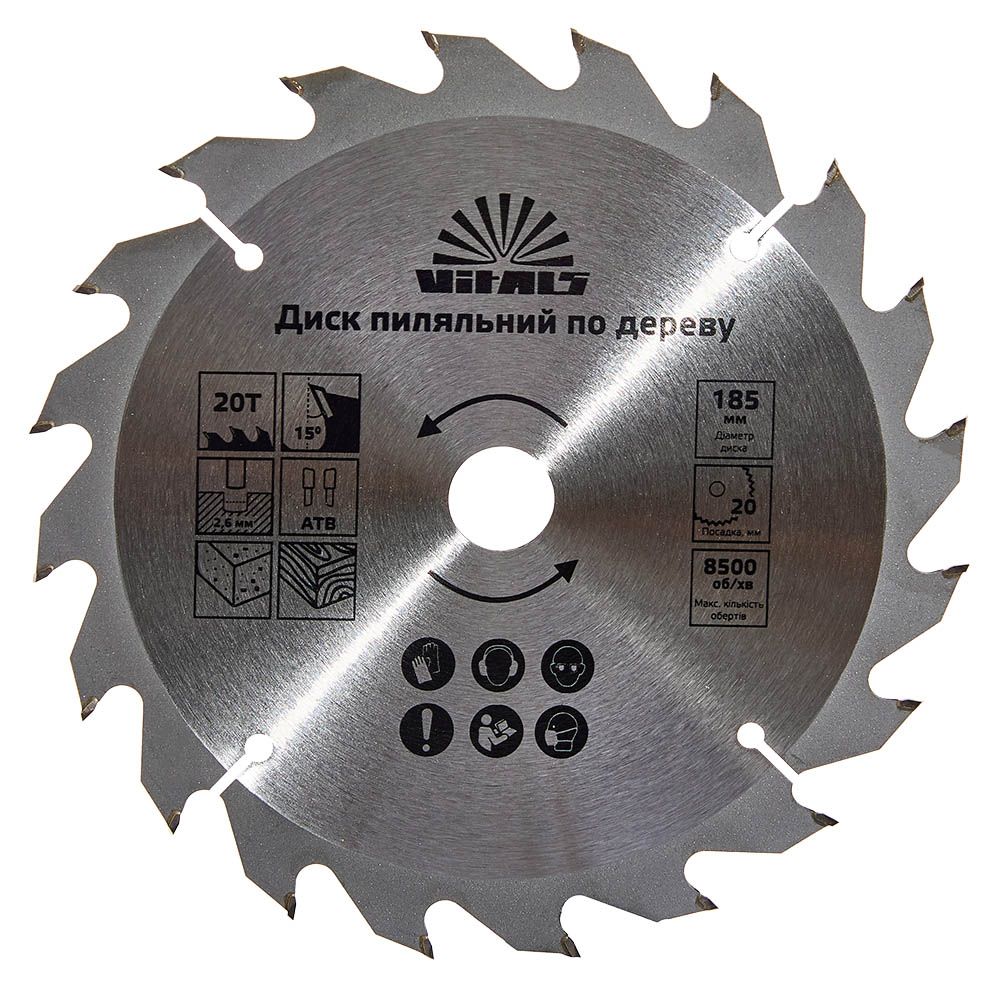 Пиляльний диск Vitals по дереву 185x20/16, ATB 20 підходить для поздовжнього та поперечного розпилу деревини - як м'якої, так і твердої породи, а також ДВП, ДСП.