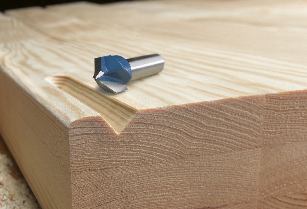 Фреза для V-образных пазов, с твёрдосплавными пластинами, с 2-мя режущими кромками, режущие кромки с прецизионной заточкой, для фрезерования V-образных пазов, декоративных пазов, для структурирования поверхностей и для установки в копировально-фрезерные станки, остриё фрезы уплощено, поэтому на дне пазов получается площадка около 1 мм шириной, для работы по твёрдой и мягкой древесине, а также древесным плитам, для всех стандартных ручных фрезерных станков с верхним расположением шпинделя.