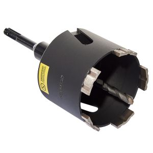 Комплект коронка алмазна по бетону Vitals Professional 82×110 мм М16 SDS-plus - це високотехнологічний та професійний інструмент для свердління отворів у бетоні, слабоармованому бетоні (арматура діаметром до 20 мм), газобетоні, пінобетоні та цеглі без примусового охолодження водою за допомогою перфоратора. Цей комплект складається з алмазної коронки, центруючого свердла та адаптера з хвостовиком SDS+ і має такі переваги: