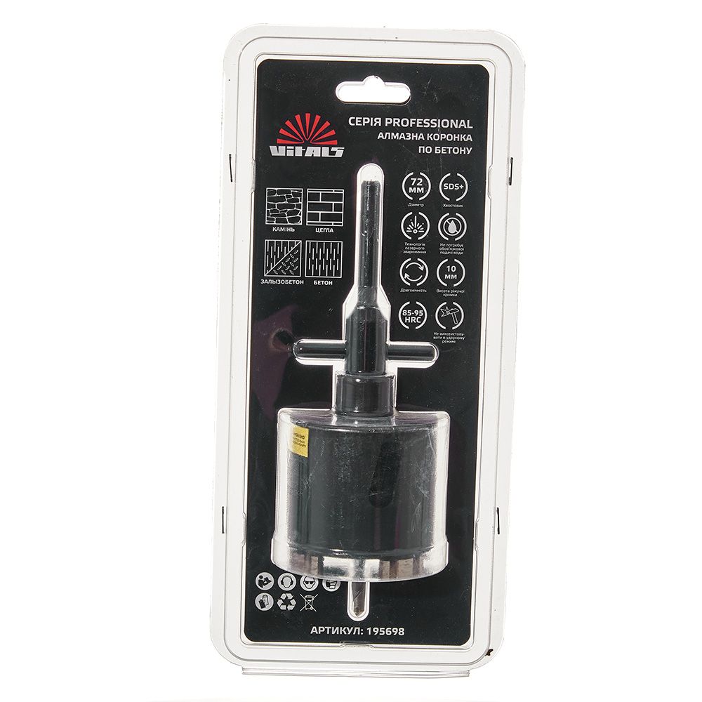 Комплект коронка алмазна по бетону Vitals Professional 72×110 мм М16 SDS-plus - це високотехнологічний та професійний інструмент для свердління отворів у бетоні, слабоармованому бетоні (арматура діаметром до 20 мм), газобетоні, пінобетоні та цеглі без примусового охолодження водою за допомогою перфоратора. Цей комплект складається з алмазної коронки, центруючого свердла та адаптера з хвостовиком SDS+ і має такі переваги: