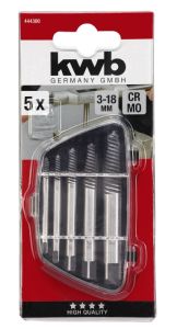 Набор экстракторов KWB предназначен для удаления сломанных болтов, резьбовых шпилек и прочего. Инструмент изготовлен из хромванадиевой стали. Этот материал известен своей прочностью и устойчивостью к высоким нагрузкам. Инструменты, изготовленные из этого сплава, отличаются надежностью и продолжительным сроком службы.