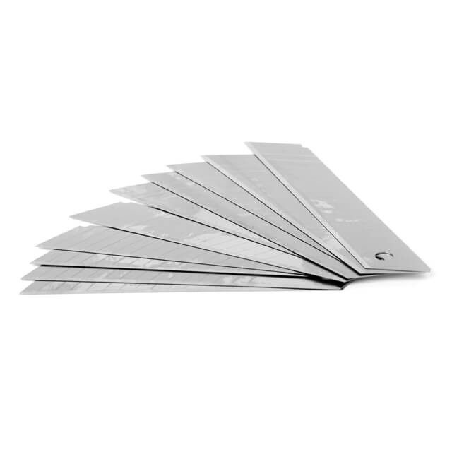Большой запас лезвий: в одной упаковке 10 лезвий по 14 сегментов, шириной 18 мм. Используются в качестве расходной части для строительных, канцелярских и малярных ножей. Изготовлены из инструментальной стали, имеют высокую прочность, даже в форме тонкого острия.