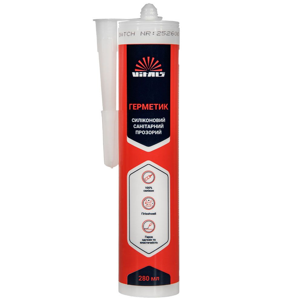 Герметик силіконовий санітарний прозорий 280 мл Vitals Fix – однокомпонентний санітарний силіконовий герметик, що містить антисептичні засоби, які перешкоджають утворенню плісняви, що дозволяє його використовувати під час виробництва та монтажу душових кабін, а також для герметизації швів у приміщеннях із підвищеною вологістю.