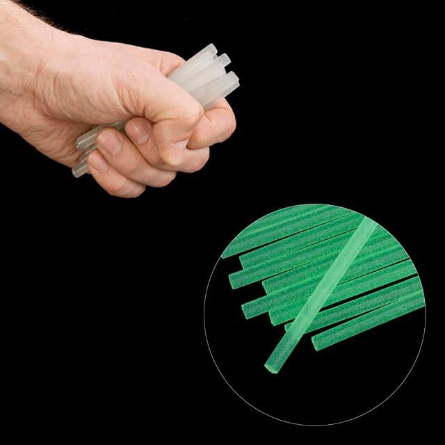 Стержни изготовлены из высококачественного сырья марки Dupont. Такой термоклей состоит из сополимера ЭВА, который нетоксичен, не выделяет запаха и не содержит растворителей. Высоковязкий клей позволяет надежно скреплять различные материалы, затвердевая по мере остывания через 30-40 секунд.