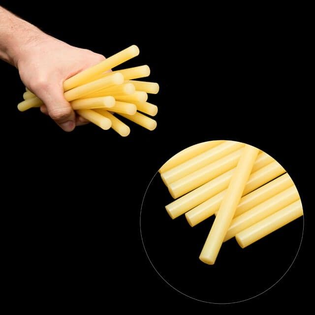 Стержни изготовлены из высококачественного сырья марки Dupont. Такой термоклей состоит из сополимера ЭВА, который нетоксичен, не выделяет запаха и не содержит растворителей. Высоковязкий клей позволяет надежно скреплять различные материалы, затвердевая по мере остывания через 30-40 секунд.