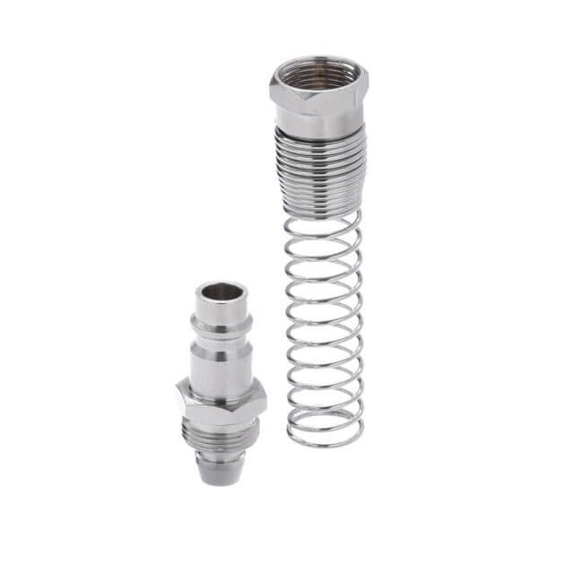 Ответная часть для быстросъемного соединения с пружиной используется для установки на спиральные и прямые воздушные шланги, чтобы обеспечить быстрое подключение пневмоинструмента к компрессору или воздушной магистрали. Также их используют для ремонта шлангов с повреждениями и для заменены вышедших из строя коннекторов.