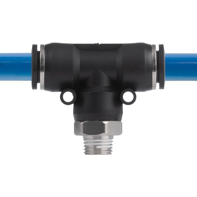 Цанговое соединение T-образной формы применяется при создании пневматических магистралей и для монтажа пневмосистем. Обеспечивает полностью герметичное соединение различных пневматических шлангов без повреждения их поверхности (PU, PE, PA) - полиуретановых, полиэтиленовых, полиамидных и пр.
