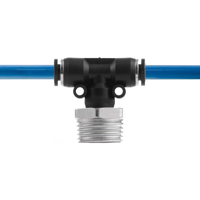 Цанговое соединение T-образной формы применяется при создании пневматических магистралей и для монтажа пневмосистем. Обеспечивает полностью герметичное соединение различных пневматических шлангов без повреждения их поверхности (PU, PE, PA) - полиуретановых, полиэтиленовых, полиамидных и пр.