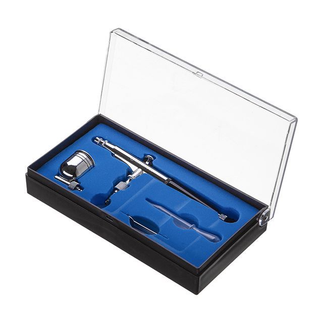 Мини-аэрограф поставляется вместе с бачком, объемом 70 мл. Также, комплект поставки PT-1504 включает пипетку-дозатор, ключ для форсунки и пластиковый футляр. Корпус и бачок изготовлены из металла, что обеспечивает повышенную износостойкость инструмента.