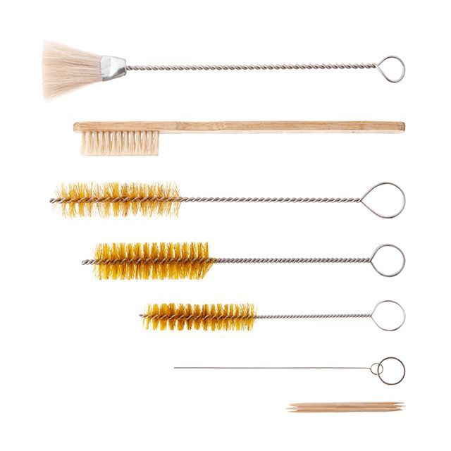 В комплект щеток для чистки пистолета-распылителя входят три чистящие щетки разных размеров с жесткой щетиной-ершиком для прочистки каналов подачи краски. Также предусмотрены иглы для прочистки отверстий и сопел, благодаря чему происходит качественное и щадящее очищение от краски. В наборе также есть щетка с деревянной ручкой и веерная широкая кисточка общего назначения для чистки корпуса пистолета.