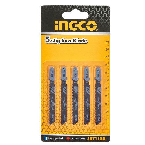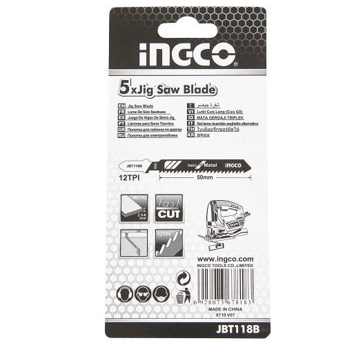 Набір пиляльних полотен по металу для лобзика 5 шт. INGCO призначений для різання листового металу завтовшки 2,5-6 мм, як робочий елемент електролобзиків. Матеріал полотна - високопродуктивна швидкорізальна сталь (HSS). Робоча довжина – 50 мм. Крок зубів: 1,9-2,3 мм. У комплекті 5 лез.