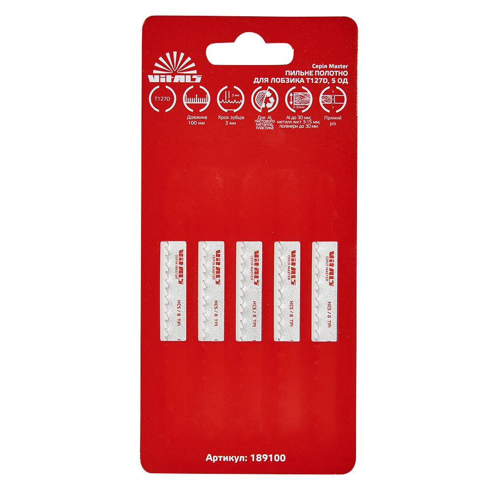 Пиляльне полотно для лобзика Vitals Master T127D 5 од. - підходить для чистого прямого різання металу завтовшки від 3 до 15 мм, алюмінію до 30 мм. Полотно виготовлене з високошвидкісної сталі HSS, яка має високу міцність, твердість і зносостійкість. Полотно має 8 зубів на дюйм (TPI) та довжину 100 мм, що забезпечує чистий та акуратний різ без сколів. Підходить для лобзиків із системами кріплення під Т-подібний хвостовик. Поставляється в упаковці по 5 одиниць.
