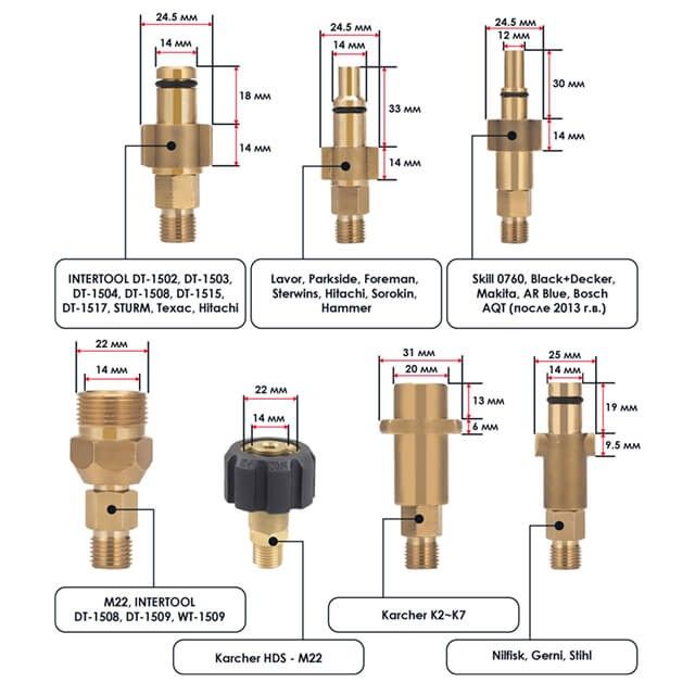 Совместимость:INTERTOOL (кроме DT-1505/1507), Karcher K2-K7, Karcher HDS, Skill 0760, Black+Decker, Makita, Bosch серия AQT после 2013 г., Nilfisk, Stihl, Gerni, STURM, Техас, Hitachi, Lavor, Parkside, Foreman, Sterwins, Sorokin, Hammer, Elitech, Champion