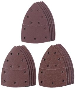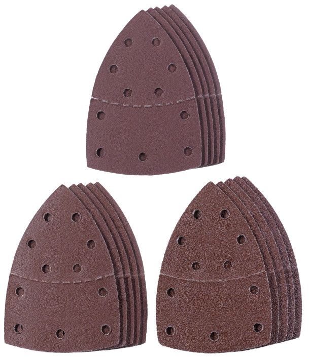 Набор шлифовальной треугольной бумаги KWB размером 150х150х100 мм. Тип крепления - липучка. Для обработки дерева и металла. В комплекте шлифовальные листы: 5 листов зерном Р60, 5 листов зерном Р120 и 5 листов зерном Р180.