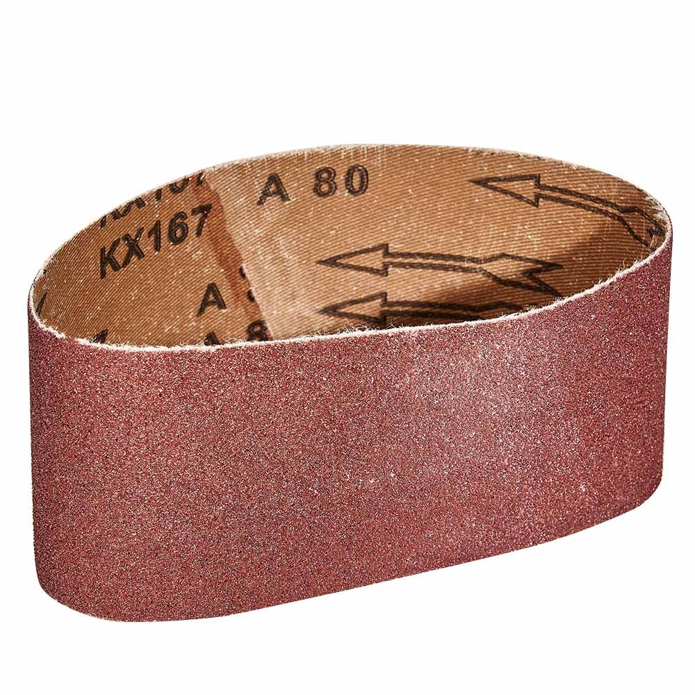 Абразивний матеріал стрічки — електрокорунд, зернистість — Р80. Міцна та еластична тканинна основа не рветься під час експлуатації, що забезпечує тривалу роботу навіть із міцним матеріалом. Посилений тип сполучного шва підвищує міцність і не викликає биття.
