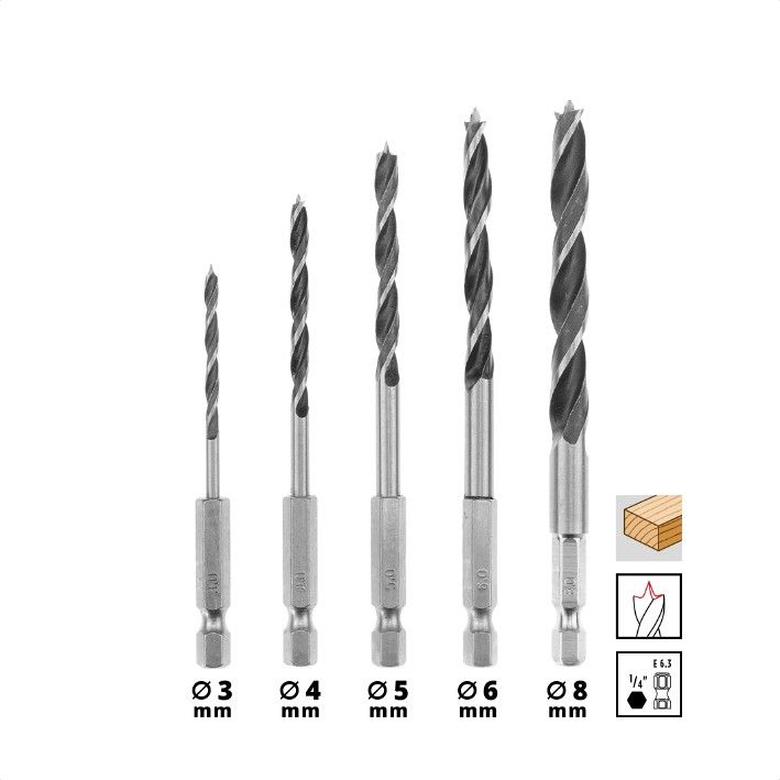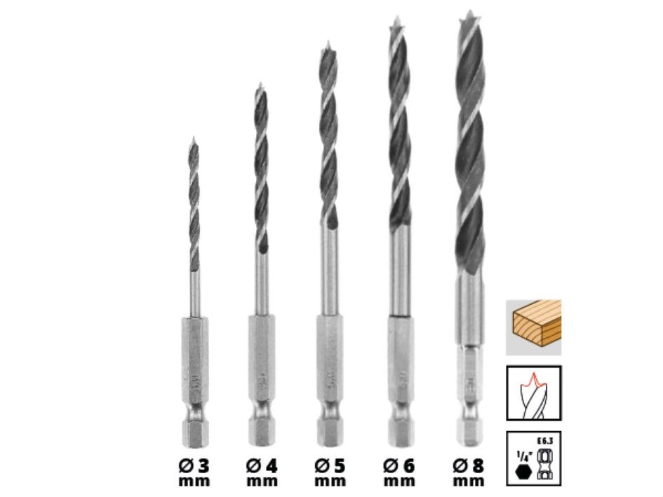 5 свердел по дереву (3-8 мм) з кованої вуглецевої сталі