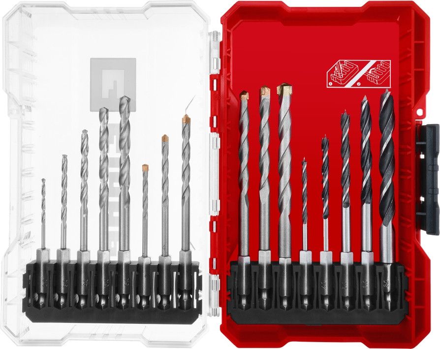 Высокое качество бренда KWB, принадлежащего Einhell 5 сверл по металлу (2-6 мм) из кованой стали HSS с углом 135° 5 сверл по дереву (3-8 мм) из кованой углеродистой стали 6 сверл для бетона (3-8 мм) из кованой углеродистой стали Все распространенные диаметры с хвостовиком E 6.3 Практический кейс для хранения Для сверлильных патронов и держателей бит в аккумуляторных отвертках и дрели M-CASE от Einhell представляет собой набор сверл из 16 предметов с большим выбором популярных диаметров для различных материалов и применений. Набор Einhell – это идеальный выбор как для мастеров, так и для профессионалов, эффективное и удобное решение, которое легко справится с самыми разными проектами сверления. В набор входят 5 сверл по металлу (2/3/4/5/6 мм) из прокатной стали HSS с раздвоенным на 135° острием, обеспечивающим точное сверление без проскальзывания. Это позволяет увеличить скорость работы. Также в набор входят 5 сверл по дереву (3/4/5/6/8 мм) из прокатной углеродистой стали. Они оснащены центрирующим наконечником, обеспечивающим точное позиционирование и точные результаты сверления. Для сверления каменной кладки и известкового песчаника предназначено 6 сверл по камню (3/4/5/2x6/8 мм), изготовленных из кованой углеродистой стали. Сверла для камня в наборе оснащены пластиной из твердого металла, что обеспечивает длительный срок службы и высокую режущую способность. Все сверла оснащены хвостовиком E 6.3 и поэтому подходят к обычным сверлильным патронам и держателям бит обычных аккумуляторных шуруповертов. Идеально подходят для сверления пластин, пластика, каменной кладки, известкового песчаника, а также жесткой и мягкой древесины. Набор Einhell расположен в удобной коробке со специальным дизайном Einhell и предлагает организованное место для хранения всех компонентов. Прозрачная крышка позволяет быстро и легко идентифицировать отдельные сверла Einhell, а надежный зажимной замок с автоматической блокировкой обеспечивает надежное закрытие. Широкий ассортимент первоклассных сверл и продуманные решения для хранения позволяют полностью сосредоточиться на работе.