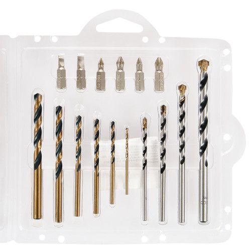 У набір входять: спіральні свердла HSS (6 шт), свердла по бетону (4 шт), біти для викрутки довжиною 25 мм (6 шт).