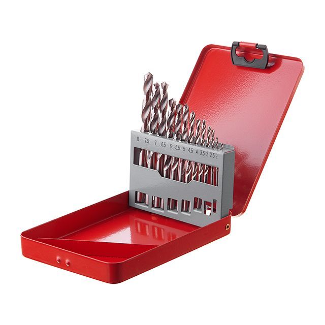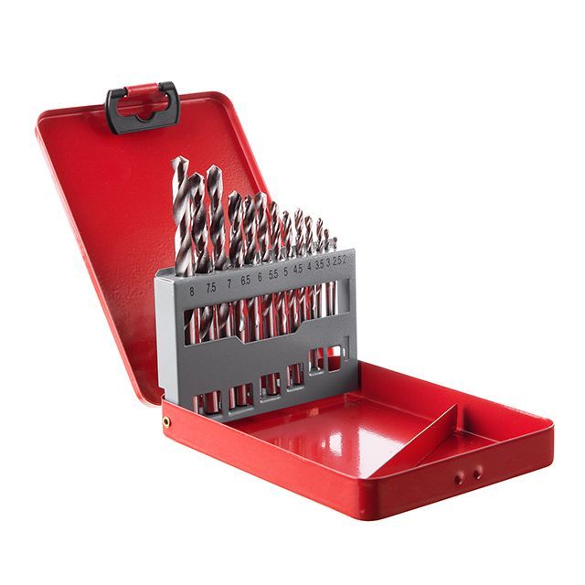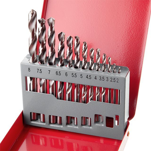 В наборе 13 сверл: 2, 2.5, 3, 3.5, 4, 4.5, 5, 5.5, 6, 6.5, 7, 7.5, 8 мм.
