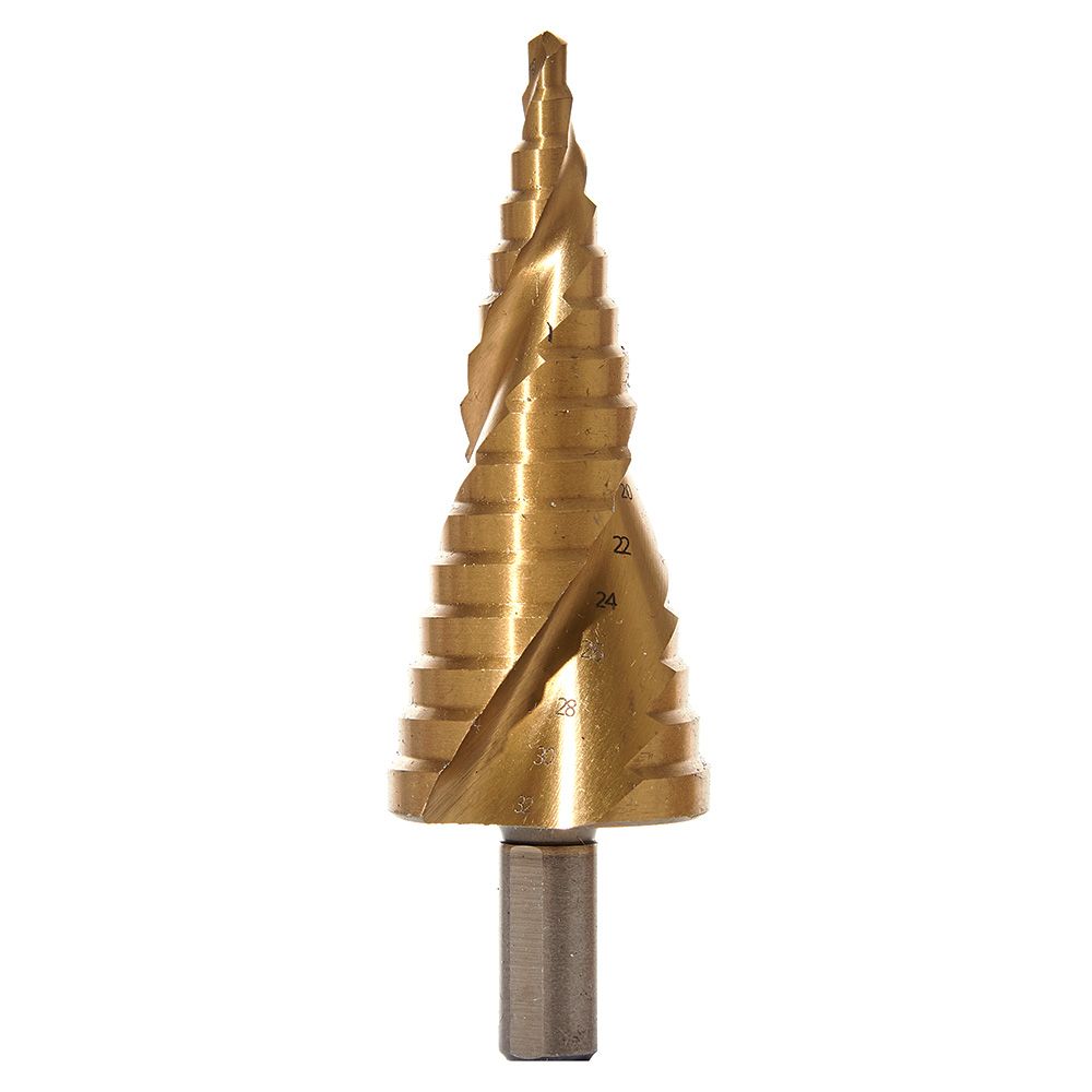 Свердло ступінчасте спіральне 4-32 мм Vitals Master – це універсальне свердло для свердління отворів різного діаметра в різних матеріалах, таких як сталь, алюміній, мідь, пластик тощо. Це свердло звільняє від необхідності безперервно змінювати свердла, тому що має ступінчасту форму з різними діаметрами від 4 до 32 мм. Свердло має високу ефективність при свердлінні отворів великого діаметра, бо має кут заточування 125 °, який забезпечує швидке та легке проникнення в матеріал. Твердість різальних кромок свердла становить 58-62 HRC, що гарантує тривалий термін служби та надійну роботу. Свердло має покриття нітридом титану, який підвищує стійкість ріжучої кромки на максимально довгий термін і надає свердлу золотистого кольору. Ріжучі кромки свердла сприяють створенню відмінної геометрії отвору, що відповідає діаметру свердла. Свердло має циліндричний хвостовик з тригранним фрезеруванням для кращого утримання в патроні і запобігання провертанню. Свердло має спіральну ріжучу кромку, яка забезпечує м'яке та плавне свердління, має підвищену ріжучу здатність та покращує виведення стружки. Свердло ступінчасте спіральне підходить для роботи з електричними та акумуляторними дрилями. Свердло ступінчасте спіральне 4-32 мм Vitals Master – це ідеальний інструмент для свердління отворів різного розміру в різних матеріалах.