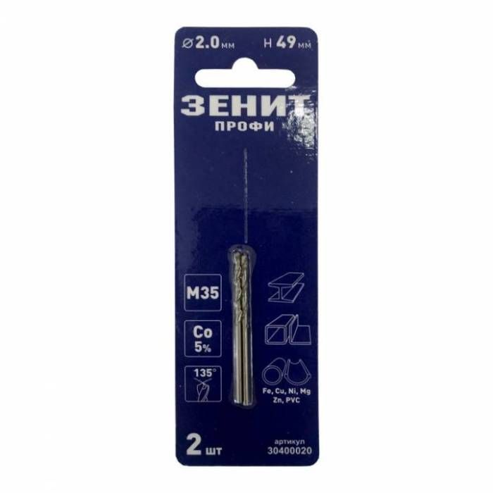 Свердло по металу діаметром 2,0 мм і довжиною 49 мм виготовлене з високоякісної швидкорізальної сталі М35 (Со5%) з нанесенням кобальтового покриття.