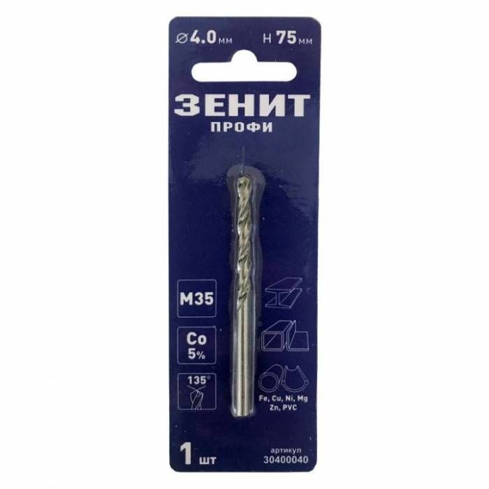 Свердло по металу діаметром 4,0 мм і довжиною 75 мм виготовлене з високоякісної швидкорізальної сталі М35 (Со5%) з нанесенням кобальтового покриття.