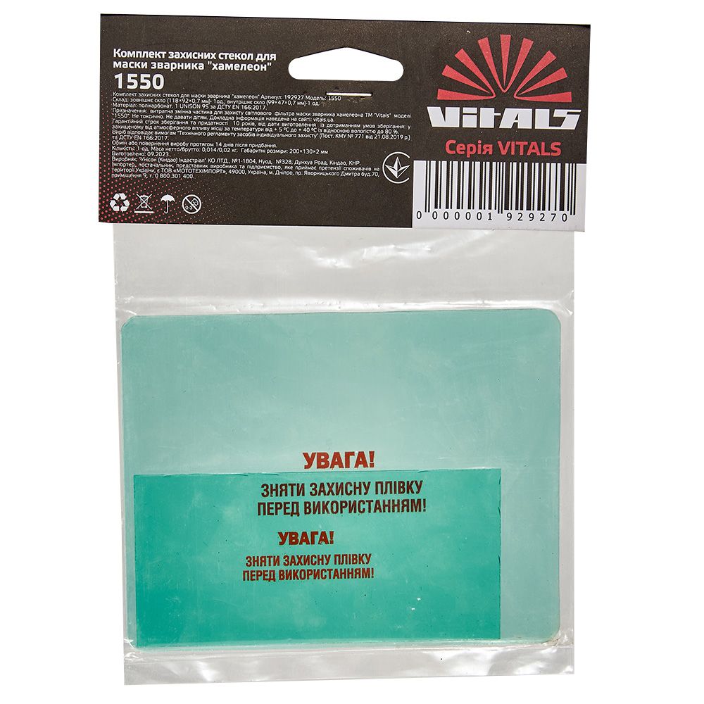 Використання комплекту захисних стекол Vitals 1550 подовжує термін служби маски, підтримує чіткість огляду і сприяє безпеці оператора. Це незамінний аксесуар для професіоналів і аматорів, які цінують якість і комфорт у роботі зі зварювальним обладнанням.
