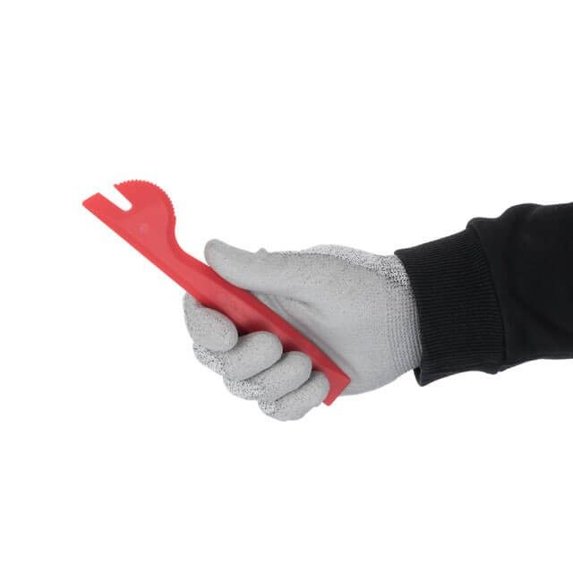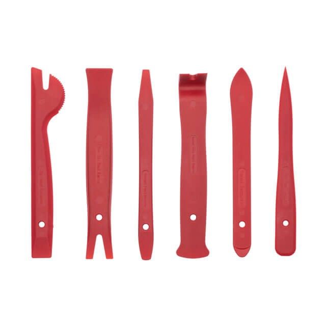 Набор включает в себя 6 предметов разной формы, с круглыми, острыми, широкими и узкими краями, которые позволяют работать с большинством панелей обшивки. На трех съемниках имеются прорези для демонтажа клипс крепления, также в каждом инструменте есть отверстие для его удобного хранения на стене. На съемниках отсутствуют задиры и швы, которые могут повредить обшивку или травмировать мастера.