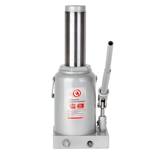 Домкрат с одним штоком имеет простую конструкцию и работает по принципу сообщающихся сосудов. При работе ручным рычагом с помощью насоса масло нагнетается в рабочем цилиндре, давление повышается и поршень с грузом поднимается. Поэтому до 80% прикладываемых усилий конвертируется в полезную в работу. Также обеспечивается плавное поднятие грузов за счет несжимаемого свойства масла.