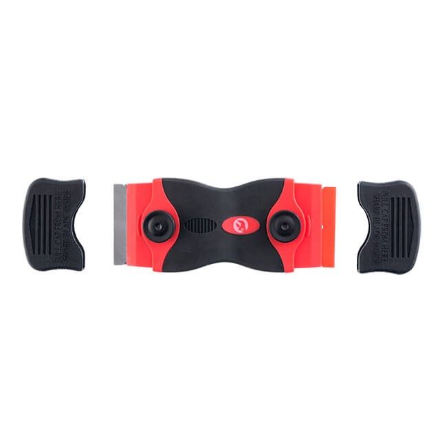 На обоих торцах инструмента расположены сменные лезвия, пластиковое и стальное. Ширина рабочей части составляет - 40 мм. Оба лезвия надежно защищены колпачками, что исключает повреждения при хранении и транспортировке ножа-скребка. В комплекте также поставляется по 10 запасных лезвий каждого вида.