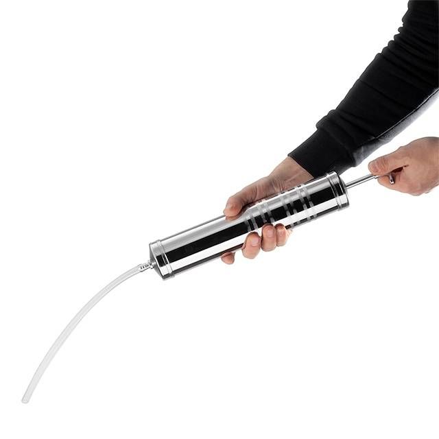 Рабочий объем шприца составляет 500 миллилитров, он заполняется смазкой вручную. Инструмент эффективен для работы в труднодоступных местах, благодаря наличию удлиненного наконечника из металла и гибкого шлага из ПВХ. В некоторых случаях это значительно упрощает работу из-за отсутствия необходимости разбора конструкции для проведения обслуживания определенных узлов.