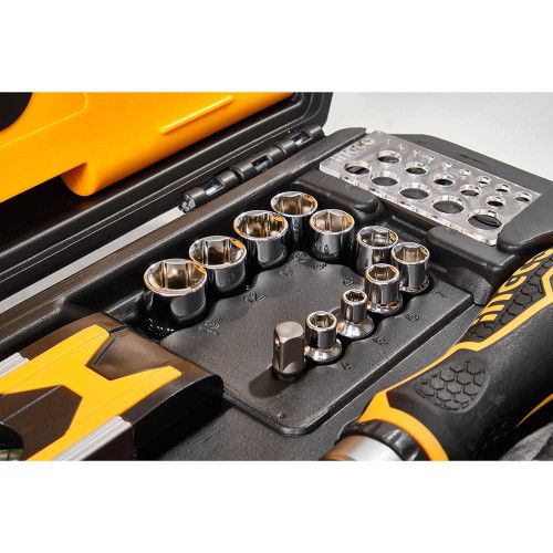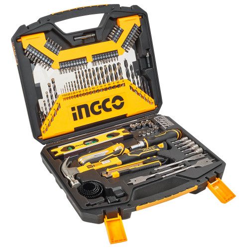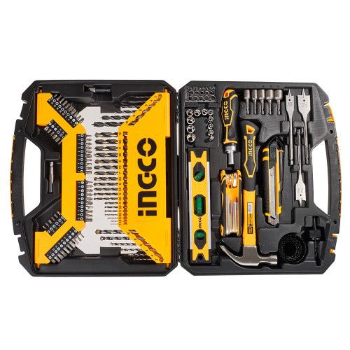 Набір налічує велику кількість необхідних предметів, а саме: свердла по бетону (6 шт), спіральні свердла по металу HSS (19 шт), свердла по дереву (6 шт), насадки-біти для викрутки довжиною 25 мм (52 шт), тримач біт (1 шт), свердла по дереву перові (3 шт), головки довжиною 48 мм (5 шт), зенківка 12 мм (1 шт), міні рівень спиртової (1 шт), ніж з комплектом змінних лез (1 шт), датчик глибини (4 шт), шестигранний ключ для датчика глибини (1 шт), вимірювач діаметру свердла (1 шт), молоток-обценьки 8 Oz (1 шт), головки торцеві змінні 1/4 "(10 шт), перехідник 4 -6 (1 шт), ручка з тріскачкою (1 шт), рулетка вимірювальна 3 м (1 шт), шестигранний ключ для датчика глибини (1 шт), коронка (1 шт), шестигранні ключі (8 шт).