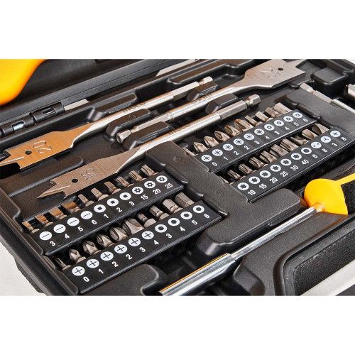 Набір налічує велику кількість необхідних предметів, а саме:мсвердла по бетону (5 шт), спіральні свердла по металу HSS (10 шт), спіральні свердла по дереву (5 шт), свердла по дереву перові (3 шт), тримач бітів (1 шт), насадки-біти для викрутки довжиною 25 мм (40 шт), зенковка 12 мм (1 шт), магнітний хвостовик (1 шт), вимірювач діаметру свердла (1 шт).