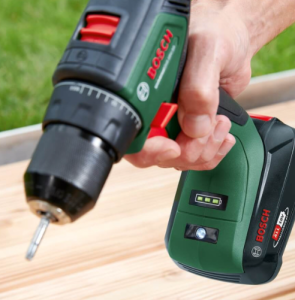 Bosch UniversalDrill 18V-60 — це універсальний побутовий дриль-шурупокрут, що працює від 18В акумуляторів. Безщітковий двигун дає змогу досягати великого крутного моменту в 60 Нм із частотою обертів 0-1900 об/хв. Може виконувати свердління в сталі до 13 мм, у дереві до 35 мм. Артикул поставляється з 2 акб на 2 Ah, зарядним пристроєм у пластиковому кейсі.