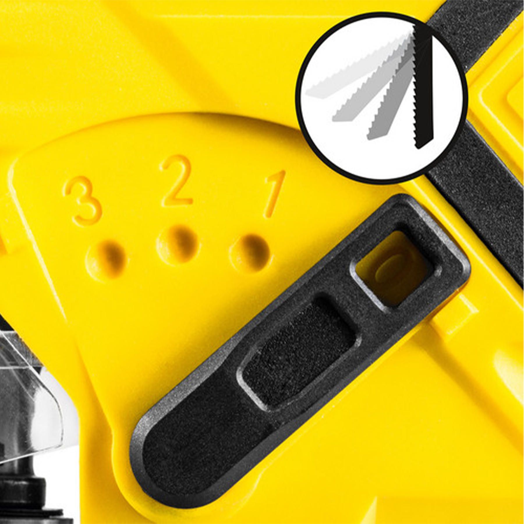 Швидкозажимний патрон дозволяє замінити пиляльне полотно без додаткових інструментів всього за кілька секунд. У разі косих різів алюмінієву підошву можна повертати до 45° в обидва боки із кроком 15°, а для захисту делікатних деталей можна прикріпити пластиковий ковзний башмак, що входить у комплект. Захисний прозорий пластиковий екран та механізм блокування випадкового увімкнення також сприяють безпечній роботі з цим електролобзиком.