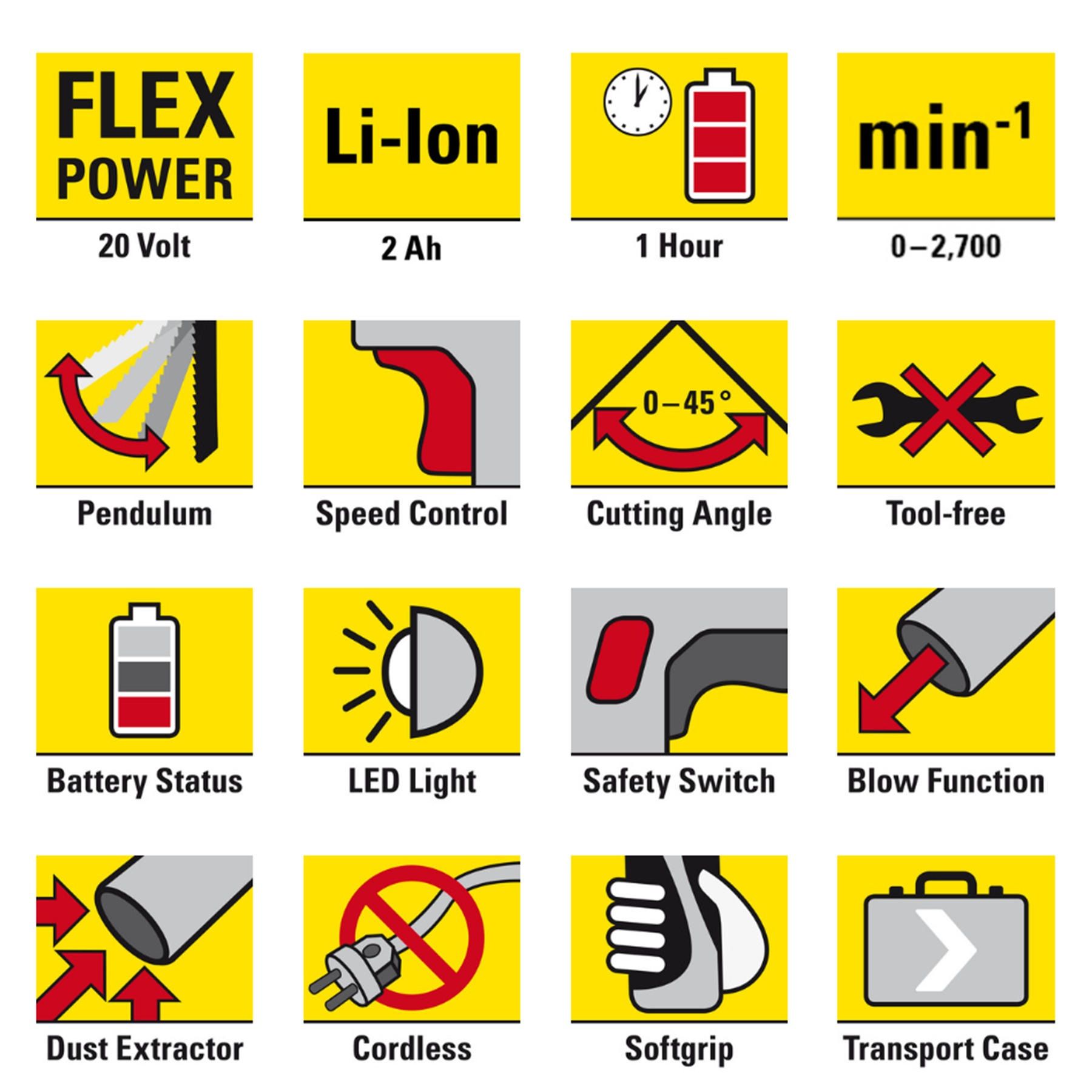 Особливості:Безщітковий двигун|Швидка заміна полотна|Індикатор рівня заряду батареї|Маятниковий хід|Плавний пуск|Під'єднання пилососа|Підсвічування робочої зони|Регулювання обертів|Регулювання швидкості ходу|Регулювання кута нахилу|Система пиловидалення|Повітряне охолодження|Затискний патрон|Регулювання швидкості|З регулюванням обертів