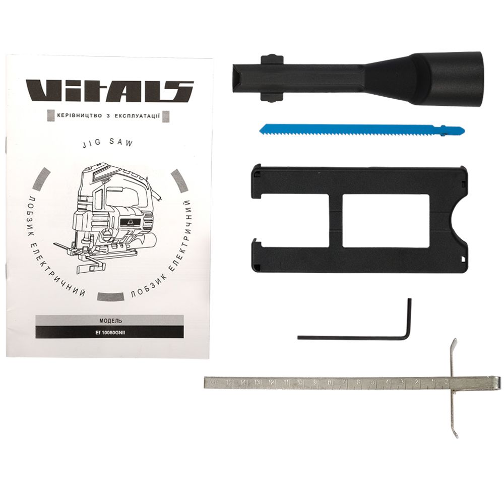 Електричний лобзик Vitals Master Ef 10080GNII, маючи відмінну продуктивність, в сукупності з малою вагою і компактним розміром, стане незамінним інструментом для прямолінійного і візерункового розпилювання деревини, деревоволокнистих плит (ДВП), деревостружкових плит (ДСП), а також пластмаси та металу.