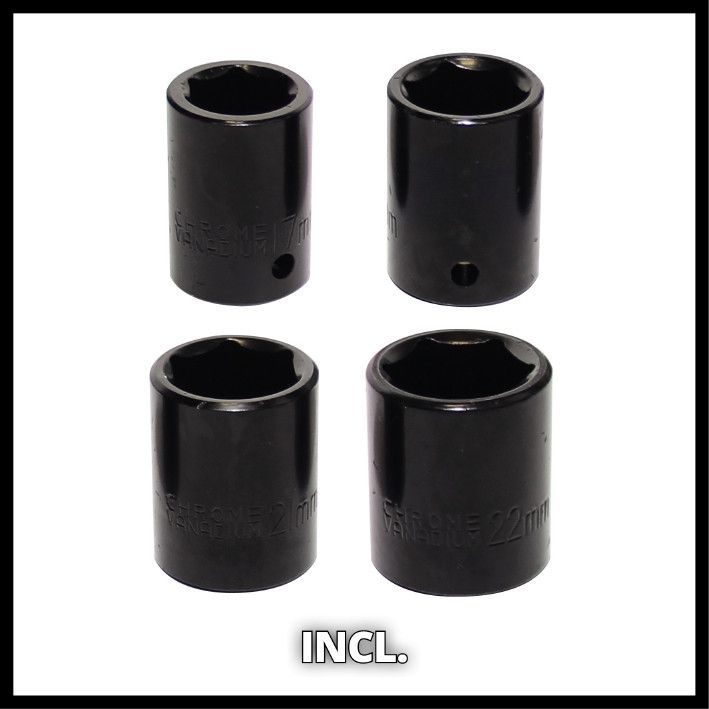- У комплекті з 4 гайковими бітами (17, 19, 21 та 22 мм)