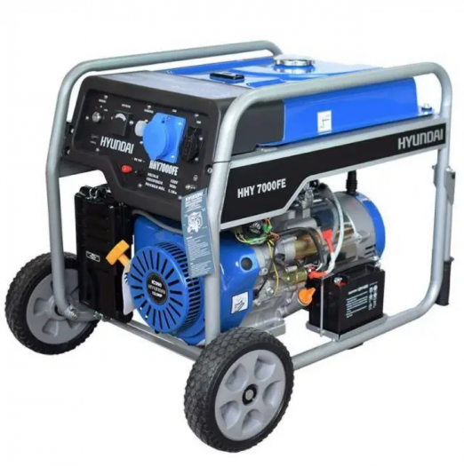 Генератора Hyundai HHY 7000 FEK максимальною потужністю 6,5 кВт має електричний і ручний стартер, великий бак з поплавком для більш тривалої роботи, чотиристоронню раму для кращого захисту і стабілізатор напруги - AVR. Панель управління має 2 розетки (постійний струм 12 В), а система контролю масла - з автоматичним відключенням двигуна. Конструкція компактна, дозволяє зручно переносити за рахунок набору коліс і ергономічних висувних ручок. Аналоговий дисплей показує частоту та напругу та забезпечує кращий контроль. Датчик рівня масла викликає автоматичну зупинку в разі нестачі масла. Він захищений від перевантаження.