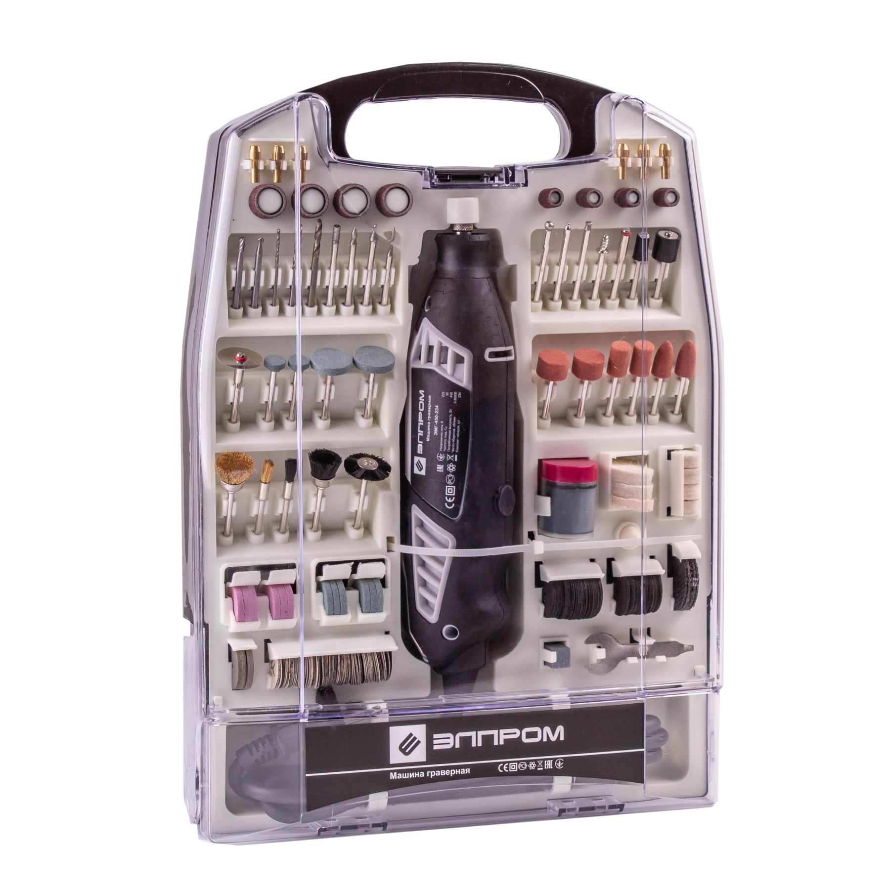 Машина гравірувальна - інструмент, який призначений для виконання широкого спектра тонких робіт по різних матеріалах. Гравер Елпром ЕМГ-450 може виконувати шліфування, різьблені роботи, щіткову чистку, полірування, розрізання, попереднє свердління. Зазначимо, що гравер має різноманітні насадки, їх використання залежить від виду виконуваних робіт. Як насадки використовуються гравірувальний різець, точильний круг, дротяна щітка, полірувальний наконечник, шліфувальний і ріжучий диски, бури, мінісвердла та інші пристосування. Регулювання швидкості дасть змогу виставляти малі оберти, які краще підходять для виконання полірувальних операцій з використанням полірувальних наконечників, також вони підійдуть для обробки тендітних виробів, при моделюванні, очищенні пазів і виконанні особливо тонких робіт. Середні швидкості рекомендуються для робіт по дереву, які не потребують високої точності. Комплектація: Пластиковий кейс Запасні вугільні щітки Посібник користувача Машина гравірувальна Елпром ЕМГ-450-234 Комплект насадок (234 шт. предметів) для обробки поверхонь