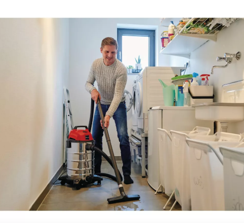 Промисловий пилосос для вологого та сухого прибирання Einhell TC-VC 1930 S – це потужний помічник з двигуном 1500 Вт для глибокого та ретельного прибирання. Пилосос оснащений міцним баком з нержавіючої сталі місткістю 30 літрів, який не піддається корозії. Інтегрований зливний гвинт забезпечує легке спорожнення бака від рідини. Функція видування дозволяє очищати важкодоступні місця потоком повітря. Чотири поворотних колеса забезпечують відмінну маневреність під час роботи. Для зручного зберігання обладнання передбачено практичний тримач аксесуарів та гачок для кабелю на корпусі. У комплект входить пластиковий всмоктувальний шланг довжиною 2,5 м (діаметр 36 мм) з високою пропускною здатністю повітря та бруду, дві телескопічні трубки, насадка для підлоги, щілинна насадка, поролоновий та складчастий фільтри.