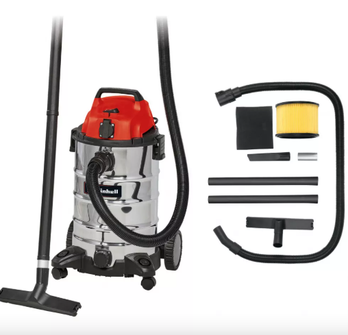 Промисловий пилосос для вологого та сухого прибирання Einhell TC-VC 1930 SA – це потужний помічник з двигуном 1500 Вт для ретельного прибирання. Пилосос оснащений міцним баком з нержавіючої сталі місткістю 30 літрів, який не піддається корозії. На корпусі інтегровано зливний гвинт для води та автоматичну розетку для підключення електроінструменту. Функція видування дозволяє очищати важкодоступні місця потоком повітря. Два великих колеса та два поворотних ролика забезпечують відмінну мобільність. Для зручного зберігання обладнання передбачено практичний тримач аксесуарів та гачок для кабелю на корпусі. У комплект входить пластиковий всмоктувальний шланг довжиною 2,5 м (діаметр 36 мм) з високою пропускною здатністю повітря та бруду, дві телескопічні трубки, насадка для підлоги, щілинна насадка, поролоновий та складчастий фільтри.