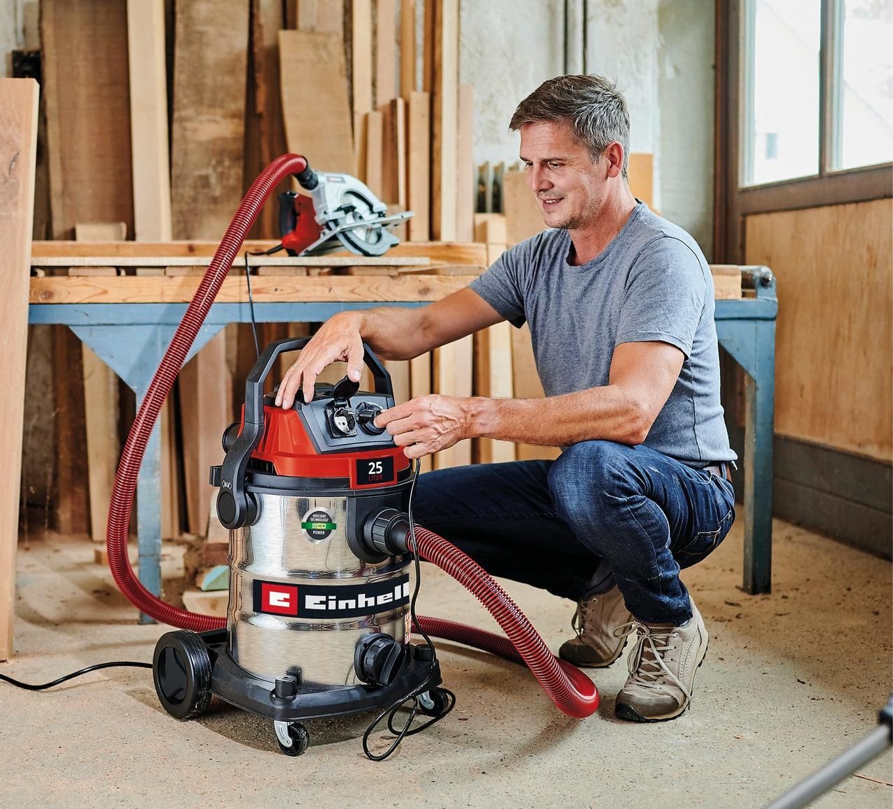 Пыль, жидкость или грязь дома или на строительной площадке: пылесос для влажной/сухой уборки Einhell TE-VC 2580 SACL тщательно очищает все материалы благодаря силе всасывания 200 мбар и потреблению энергии 1100 Вт. Оснащенный комбинированной насадкой с роликами для ковров и твердых полов, насадкой для обивки автомобильных сидений и других обивочных материалов, а также щелевой насадкой для труднодоступных углов этот пылесос справится с чем-либо. Узкие углубления можно легко очистить выдувом с помощью функции выдувания. В комплект также входят поролоновый фильтр для влажной уборки и эффективный гофрированный HEPA-фильтр, а также крепкий, устойчивый к разрывам синтетический мешок для сухой уборки. HEPA-фильтр отфильтровывает даже самые мелкие частицы из воздуха и особенно подходит для аллергиков. Пылесос также соответствует классу защиты от пыли L согласно Euronorm и поэтому может использоваться для сухой уборки опасной пыли, такой как штукатурная пыль, известь, песок и грунт. Пылесос также идеально подходит для использования на строительных площадках. Инновационная система очистки фильтра очищает его одним нажатием кнопки после длительной работы или сильного опыления и восстанавливает максимальную мощность всасывания. Электрические устройства, такие как фрезерные машины для стен или шлифмашины для гипсокартона, можно удобно подключить к автоматической розетке (макс. мощность 2200 Вт), благодаря чему пылесос также включается и выключается одновременно с подключенным электроинструментом, сохраняя в чистоте рабочее место. Бак из нержавеющей стали содержит до 25 литров грязи и жидкости, а встроенная сливная пробка для воды позволяет легко сливать впитанную воду. Благодаря колесам, роликам и ручке тележки пылесос можно легко транспортировать к месту применения. Сверхпрочный пластиковый всасывающий шланг длиной 3 метра диаметром 36 мм и питающий кабель длиной 5 метров обеспечивают радиус действия 8 метров. Благодаря держателю для аксессуаров и хранилищу для кабеля пылесос и аксессуары не только быстро и чисто хранятся, но и готовы к повторному использованию.