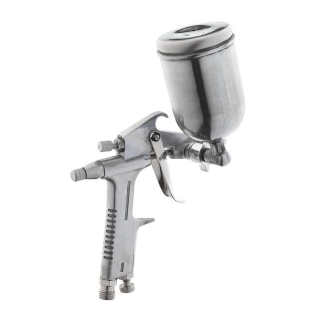 Оснащен бачком, который может изменять угол наклона относительно пистолета, что очень удобно при работе в труднодоступных местах. Полностью металлический корпус пистолета надежен и долговечен, бачок из металла позволяет использовать более агрессивные ЛКМ.