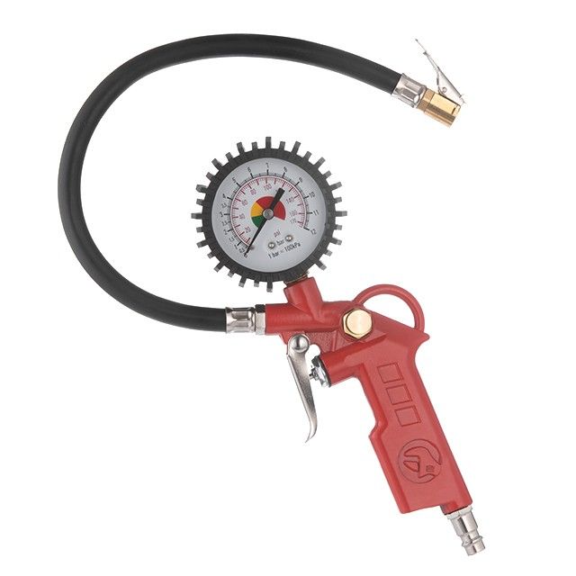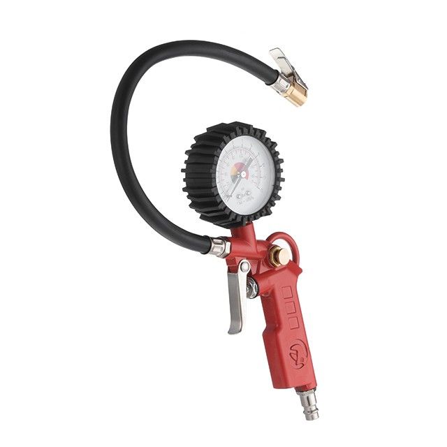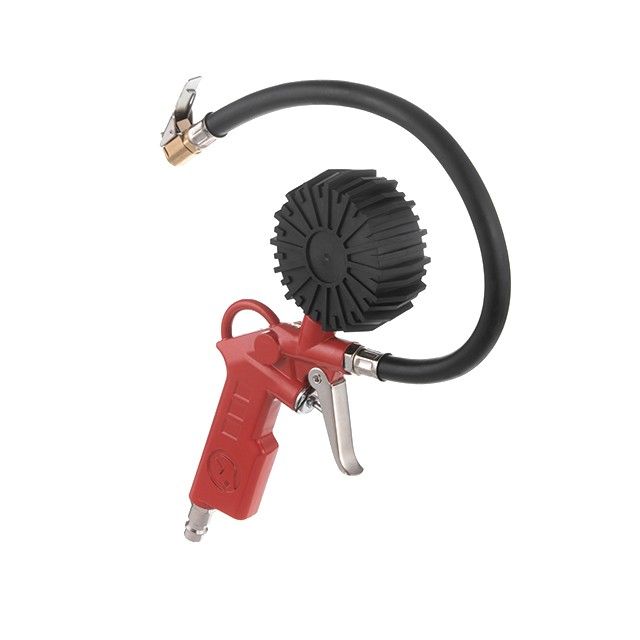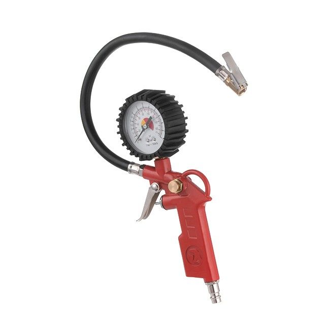 Инструмент способен за считанные минуты накачать не только шины и камеры транспортных средств, но и надувные лодки, мячи, круги и пр. Оснащен манометром для контроля давления, а также клапаном сброса воздуха, когда необходимо спустить давление до нужного показателя. Стрелочный манометр с двумя шакалами до 10 bar/PSI для удобства считывания показателей.