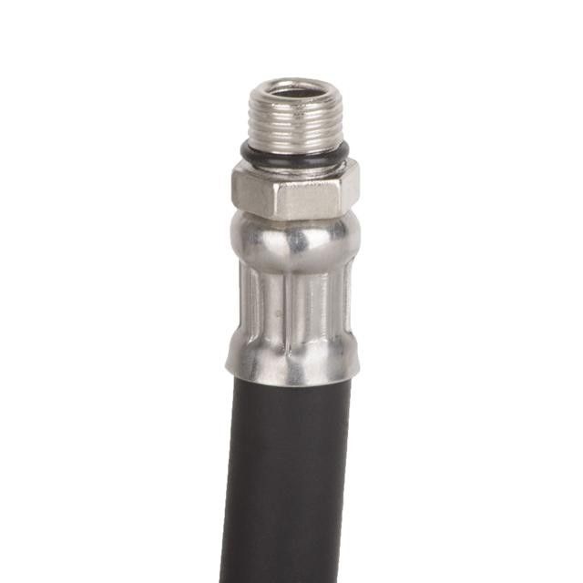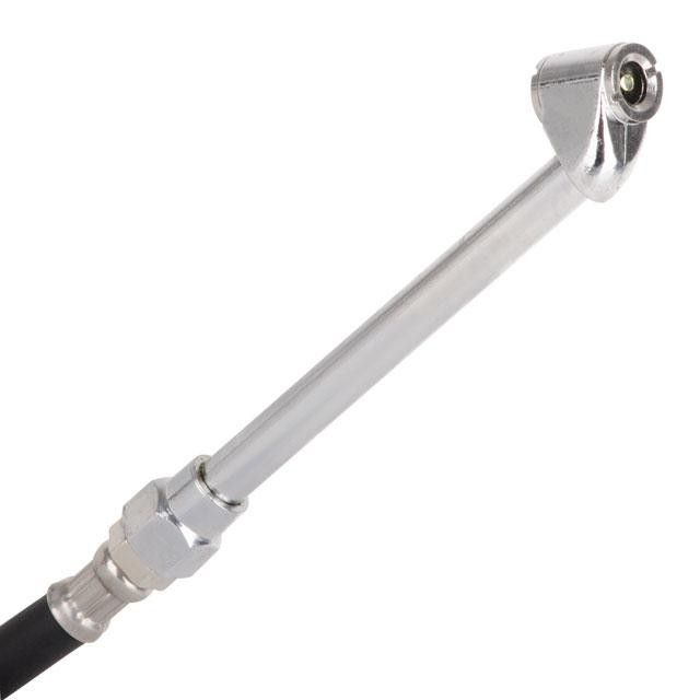 Удлинитель полностью выполнен из металла, это прочный и износостойкий в эксплуатации инструмент. Оснащен резиновым пневматическим шлангом с толстыми стенками, диаметром 12 мм, длина наконечника 145 мм, общая длина шланга 500 мм. Для подключения к пистолету для накачки шин предусмотрена наружная резьба c резиновым уплотнителем для герметичности.