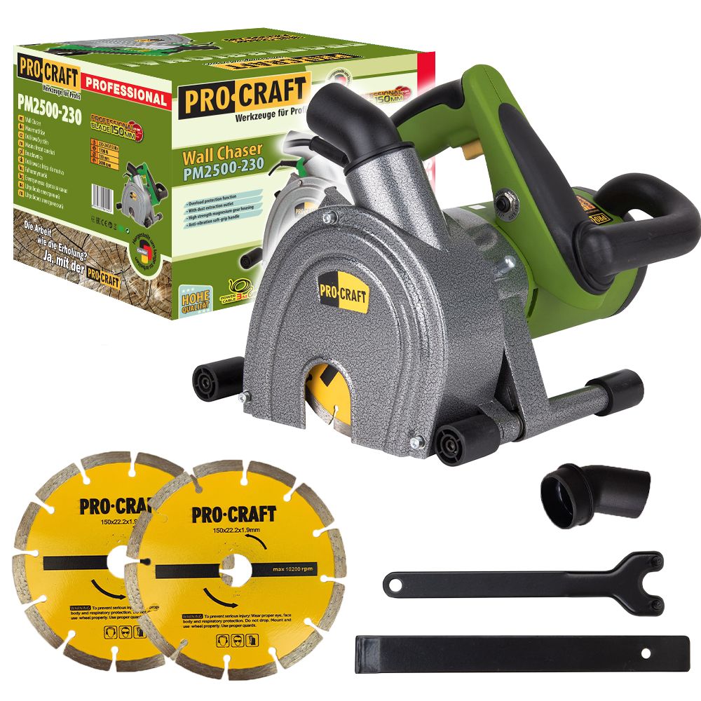 Штроборез Procraft PM2500-230 використовують на будівельних майданчиках, при виконанні ремонтних робіт. Щоб працювати їм, майстру не потрібно володіти спеціальними навичками. Сфера застосування Інструмент призначений для різання пазів в бетонних, кам'яних, цегельних поверхнях. За рахунок високої потужності двигуна вдається забезпечити бездоганну точність робіт при: прокладанні електросистем; пристрої труб водопостачання та інших інженерних комунікацій. Наявність системи плавного пуску інструменту підвищує термін його служби. На початку робіт майстер виставляє параметри різу, регулюючи глибину в діапазоні значень 0-45 мм. Конструкцією інструмента цієї моделі передбачений швидкий доступ до щітковому вузлу, якщо виникне потреба поміняти щітки колектора. Переваги та особливості Штроборез має наступні переваги: високий рівень надійності; бездоганна точність під час виконання робіт; відсутність спеціальних вимог щодо зберігання та обслуговування інструменту. За рахунок наявності функції пилососа вдається забезпечити чистоту на робочому місці.